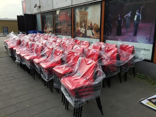 Nadat we hiervoor een aantal proefstoelen hebben neergezet, heeft men de keuze gemaakt en hebben wij 250 bezoekersstoelen afgeleverd. Uiteraard help je dan ook mee met deze stoelen op hun plaats te zetten.