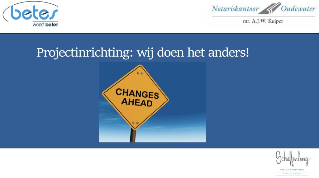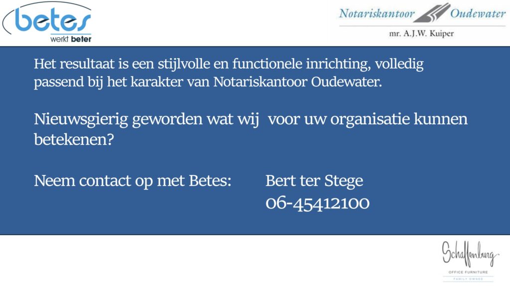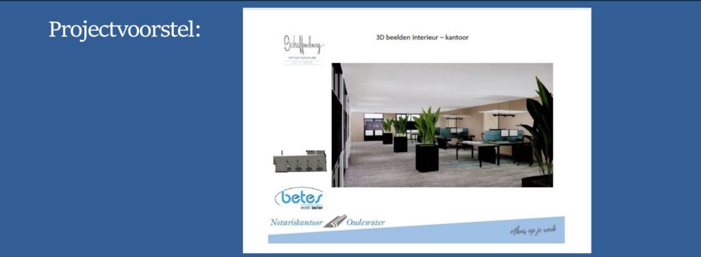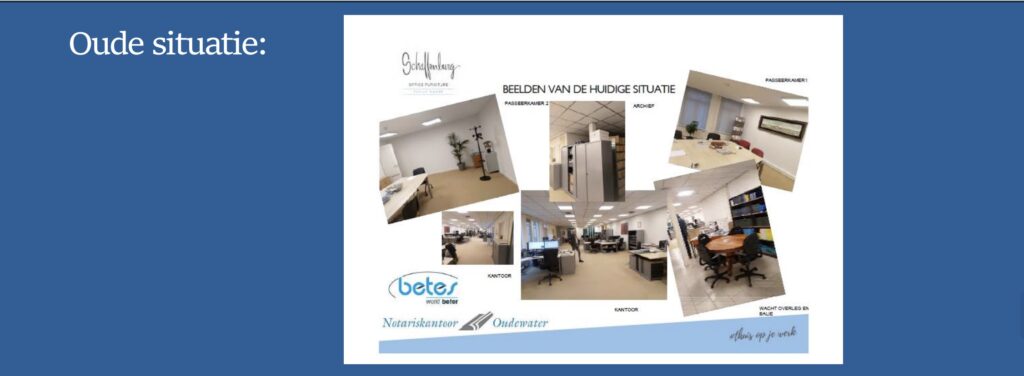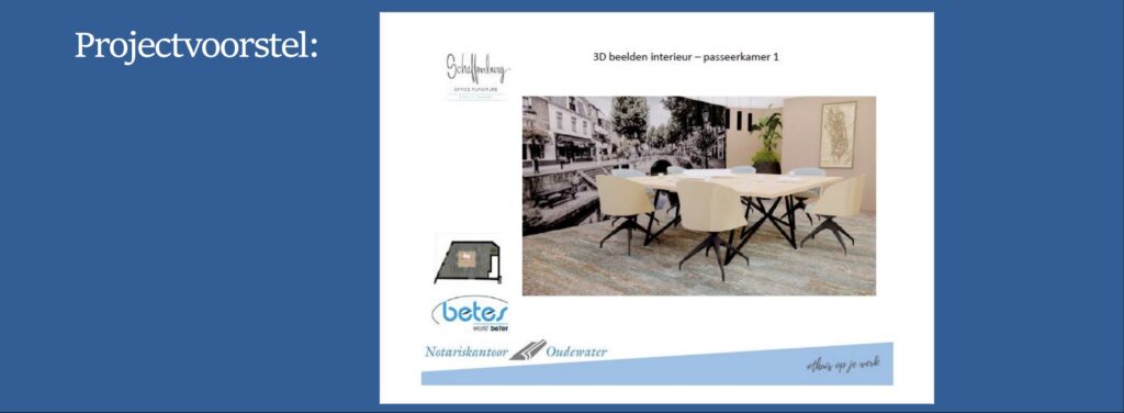 Onderstaande plan van aanpak betreft het project van Betes bij Notariskantoor Oudewater. In samenwerking met de interieurarchitect van onze partner Schaffenburg Office Furniture, laten we zien hoe we zorgvuldig en klantgericht te werk gaan.